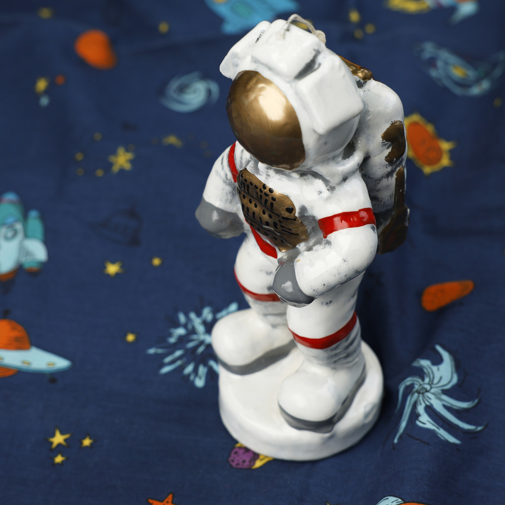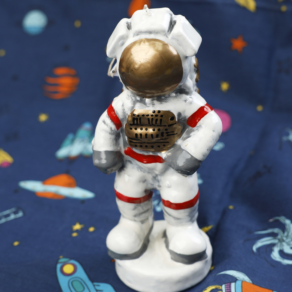 Πρωτότυπη χειροποίητη λαμπάδα με 3d σχέδιο έναν αστροναύτη. Η συγκεκριμένη λαμπάδα είναι επιτραπέζια και στέκεται μόνη της.