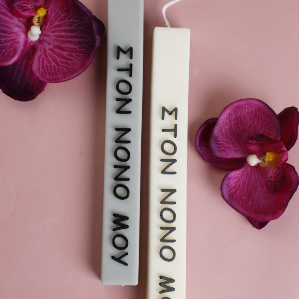 Λαμπάδα μονόχρωμη χειροποίητη αρωματική φτιαγμένη από 100% φυτικό κερί soy σε διάφορα χρώματα. Με ανάγλυφα γράμματα ¨Στον Νονό μου¨ βαμμένα στο χέρι. Μετά την Ανάσταση, η λαμπάδα χρησιμοποιείται σαν wax melts στον καυστήρα, για να αρωματίσετε τον χώρο σας. Μπορείτε να διαλέξετε το χρώμα και το άρωμα της επιλογής σας.